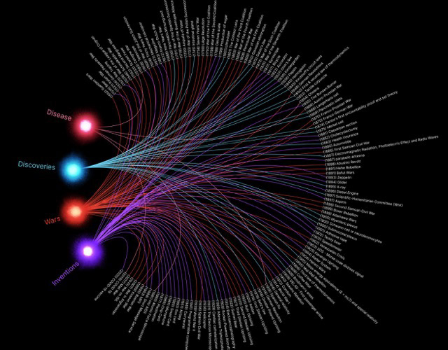 Represented Germany's modern history (1500 CE - present) by highlighting the intricate balance between destruction and creation, using a comprehensive visualization encompassing 136 events and incidents chronologically.